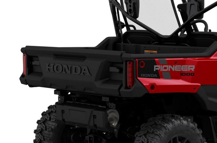 The Pioneer 1000-3P Deluxe offers all the features of the 3P with the addition of 14" aluminium wheels with an all black finish, an under-dash storage shelf to help keep useful items within arms reach, and an accessory switch panel integrated into the dashboard design. A 12-Volt power socket in the bed using a common “cigarette-lighter” style of outlet, perfect for powering things like a spotlight, work light, sprayer, air compressor, 110-Volt inverter and more.